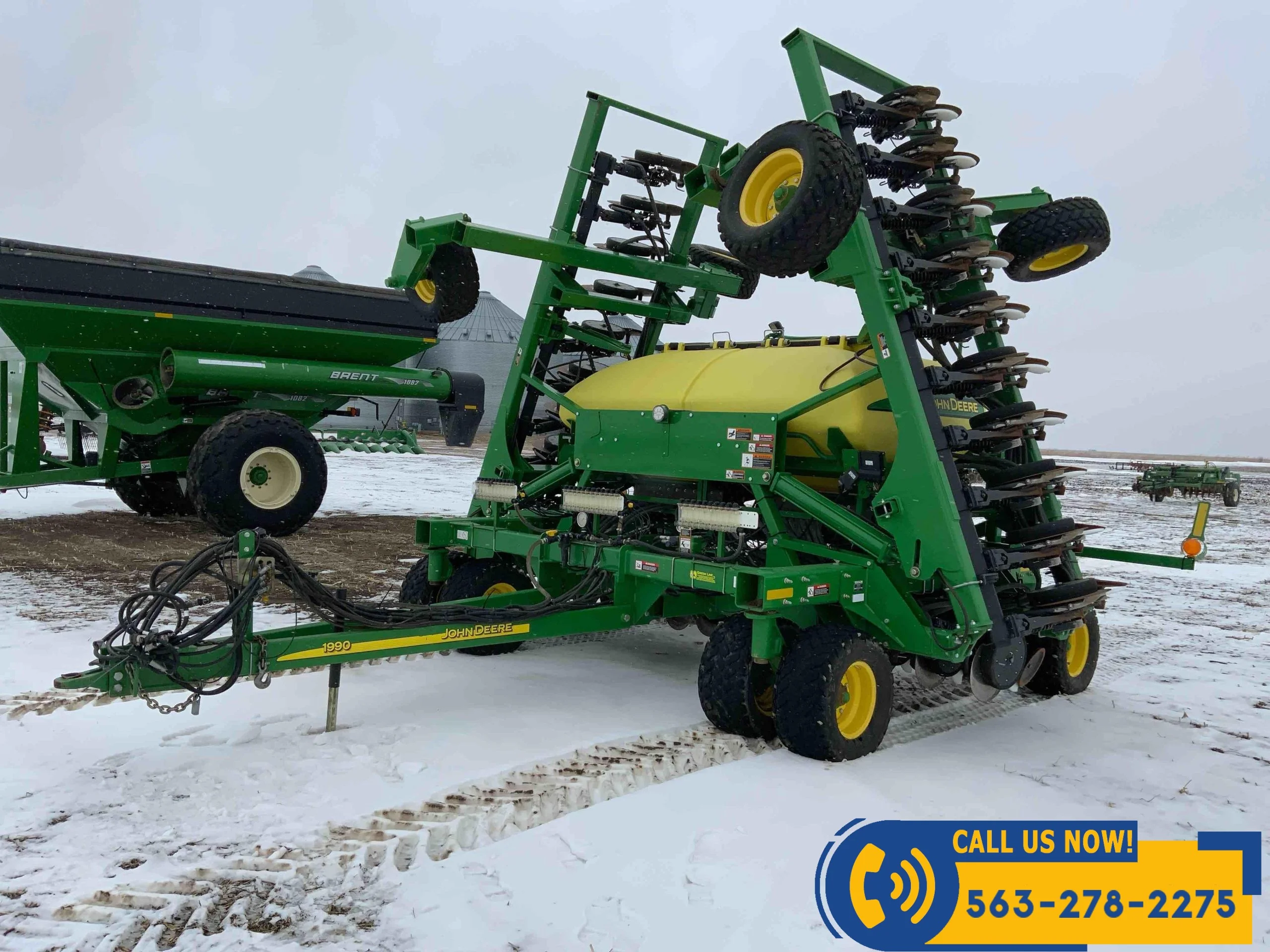 2012 John Deere 1990S Air Seeder, 32R15 configuration. Features a pin hitch, jack, and Totally Tubular popup fertilizer system with a Redball monitor. Equipped with 2” no-till gauge wheels and 31×13.5-15 tires.